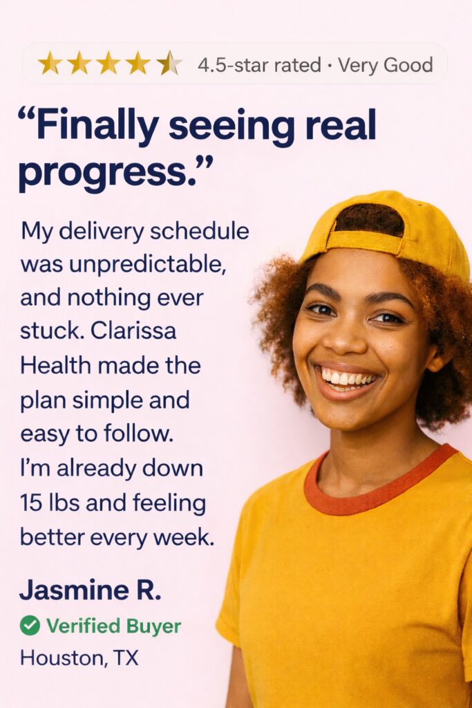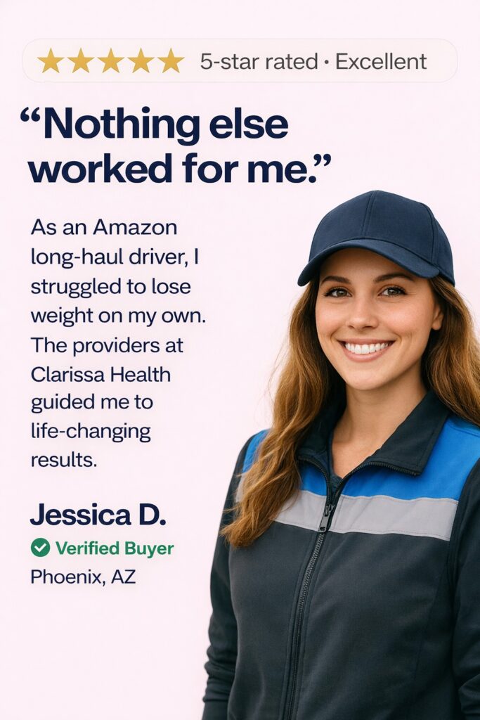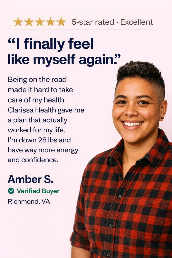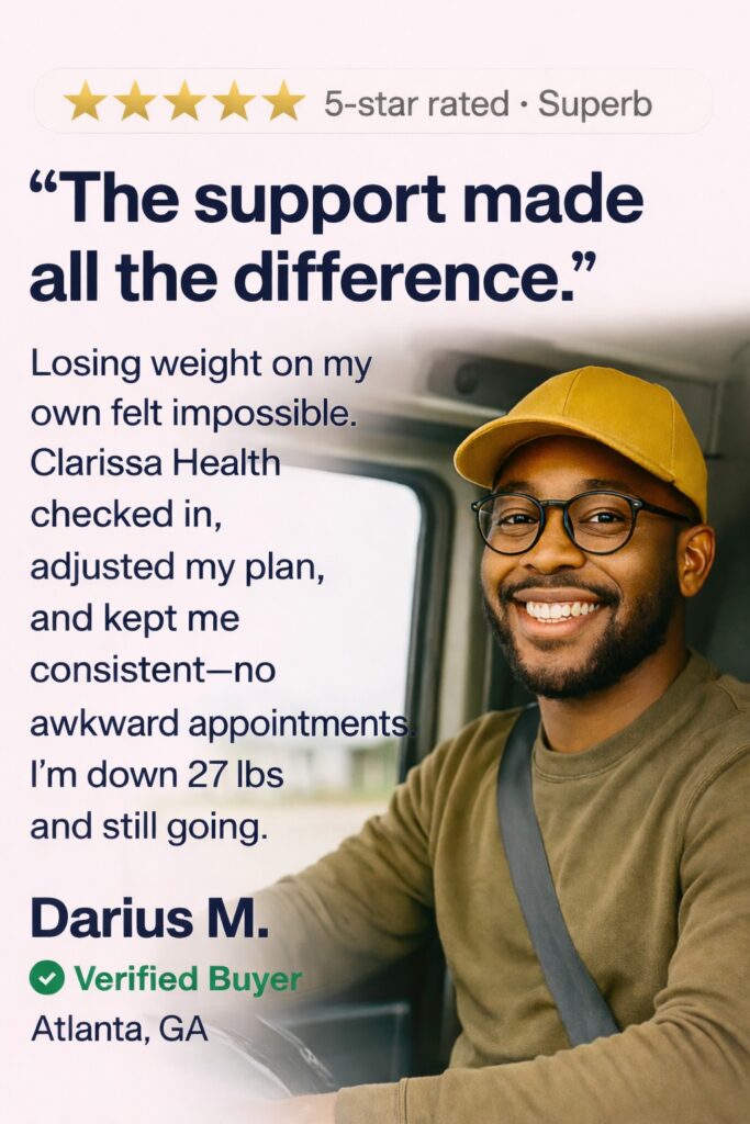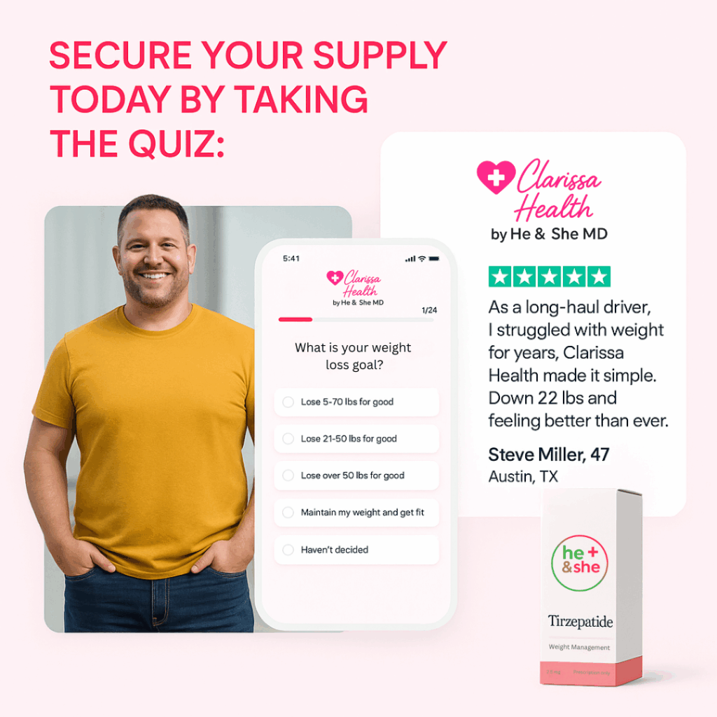 Clarissa Health is powered by He & She MD, combining prescription weight loss medications with clinician-guided care—100% online, discreet, and designed around your goals. Every treatment begins with an online medical intake reviewed by a licensed U.S. provider to determine the safest and most effective option for you.